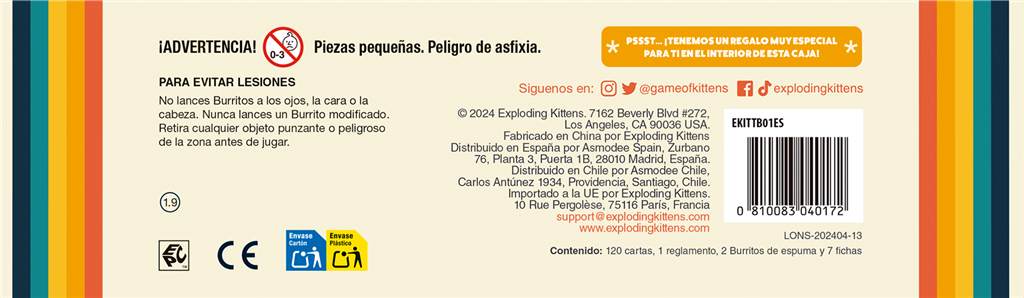 120 cartas, 2 Burritos, 6 fichas de Moratón de Burrito y 1 Insignia Témeme.